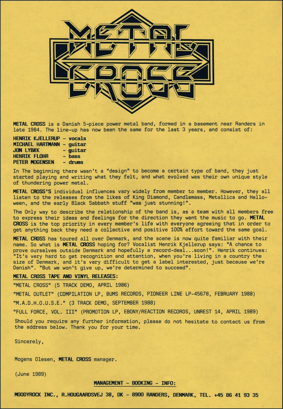 Danish Heavy Metal band, formed in 1984 in Randers. Metal Cross play a blend of classic metal with loads of catchy riffs and tasty solos.Metal Cross reunited in 2014 to play at least one show at the Metal Magic VII festival in July. The band has been active since 2014 and played the Midwinter Meltdown festival in Randers in 2016 and again in February 2019 opening for Rotting Christ and Artillery.